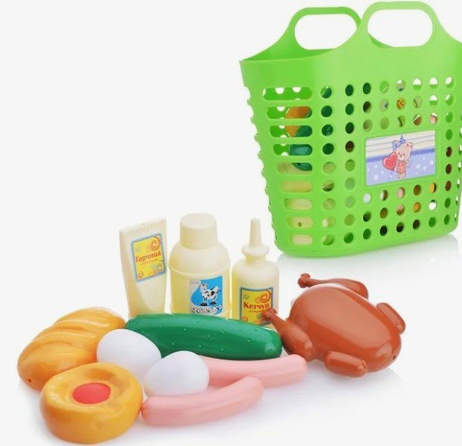 Состав: пластик, Возраст: от 3 лет, Упаковка: сеточка, Комплектация: сумка-корзина, курица, батон, огурец, сосиски 2шт, яйцо 2шт, плюшка, молоко, кетчуп, горчица, Страна изготовления: Россия,
