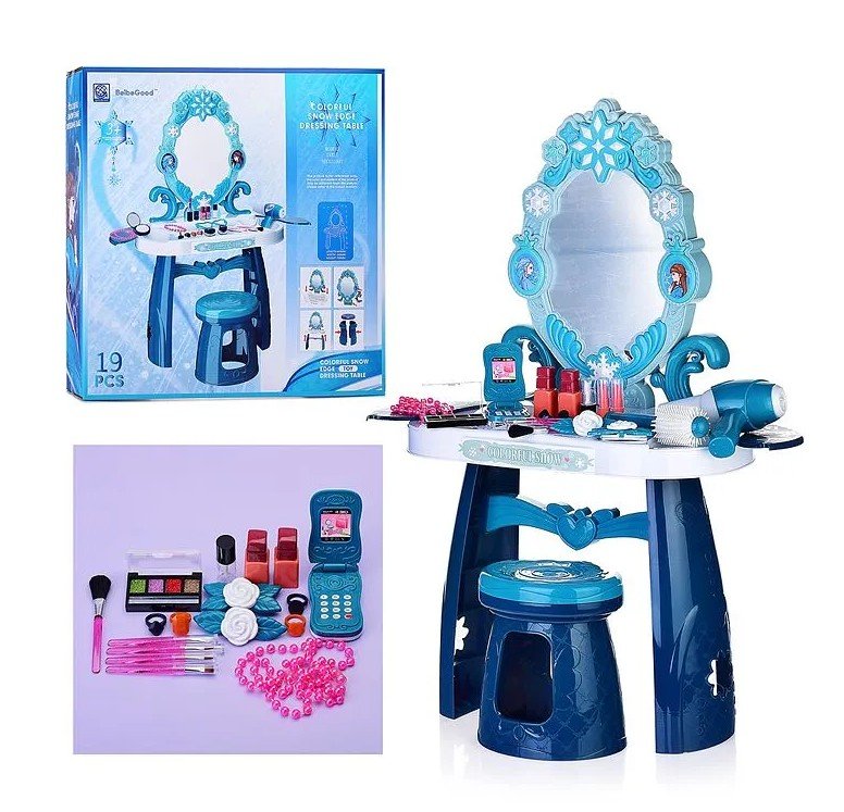• В наборе:- стол с зеркалом (44х24.5х76 см.)- стул (14.5х18х21.)- фен с вентилятором.- аксессуары.• При нажатии кнопки у зеркала горят огоньки и раздаётся волшебный звук.• Свет и звук работают от 3-х батареек АА (не входят в комплект)• Фен работает от 1 батарейки АА (не входит в комплект)• Материал: пластик.• Соответствует требованиям безопасности продукции.• Для детей от 3-х лет. Игровой набор Fashion girl позволит девочке представить себя профессиональным стилистом. Малышка научится делать причёски подружкам и куклам, а также с удовольствием будет создавать яркие образы для себя. Игра с таким набором развивает в ребенке сюжетно-ролевое мышление, воображение и мелкую моторику. Игрушка изготовлена из высококачественных материалов.