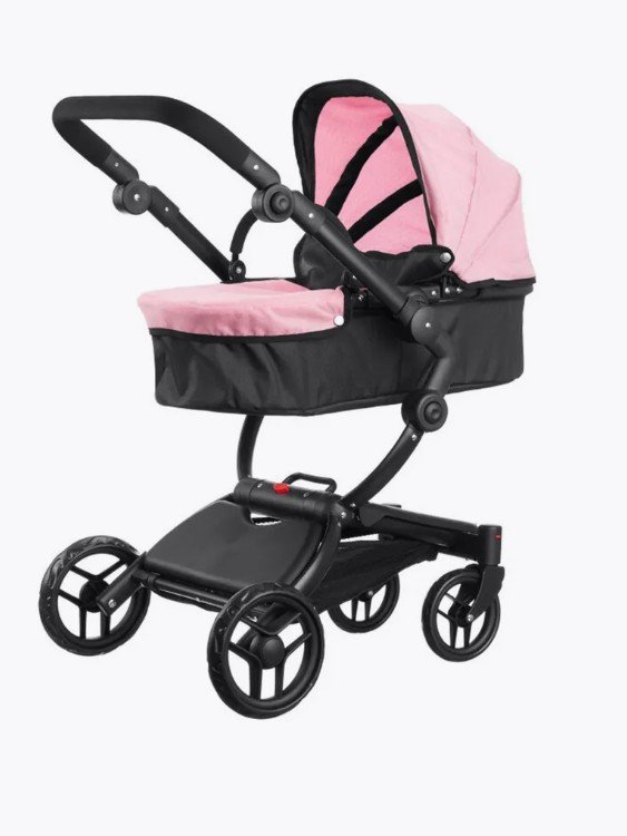 Стильная коляска-трансформер, в которой дети могут покатать любимые игрушки. Всё по-настоящему: металлическая рама, резиновая накладка на ручке для комфортной игры, чехол, бампер и съёмная люлька.