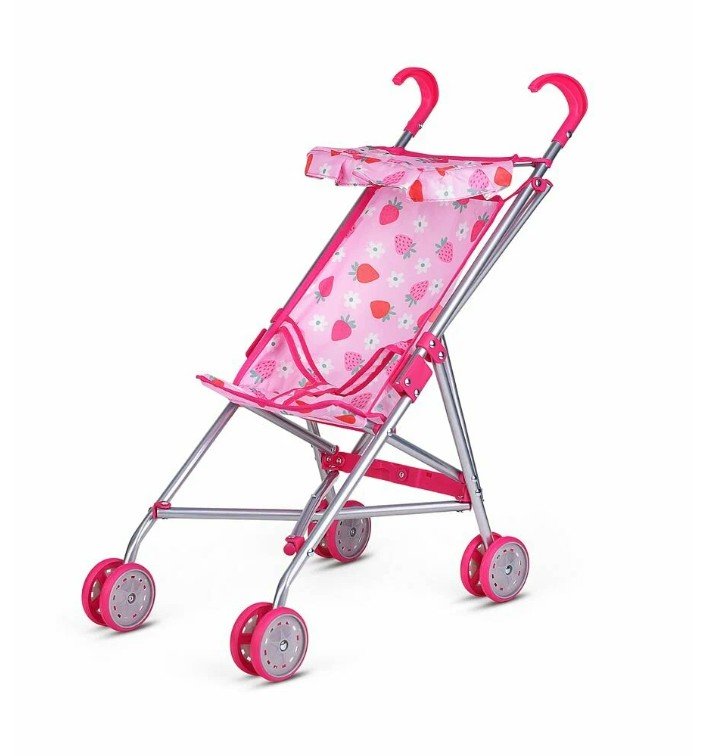 - Коляска для кукол металлическая, складная, прогулочная с козырьком, цвет розовый с клубничкой. 9302S