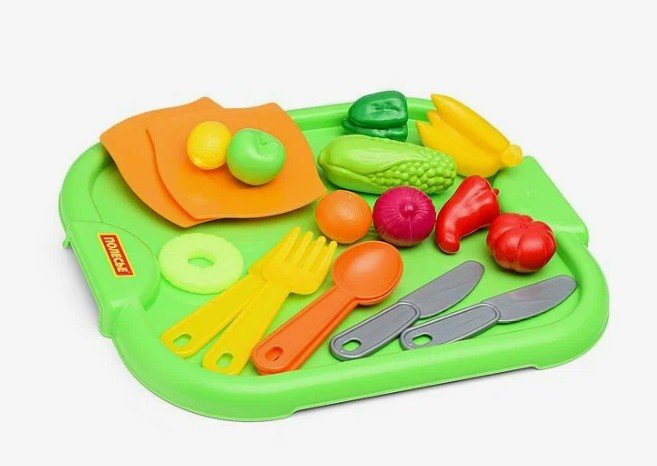 В наборе: - поднос (31х25. 5 см. )- 2 тарелки (9. 5х9. 5 см. )- 2 ложки, 2 вилки, 2 ножа. фигурки продуктов (10 предметов)