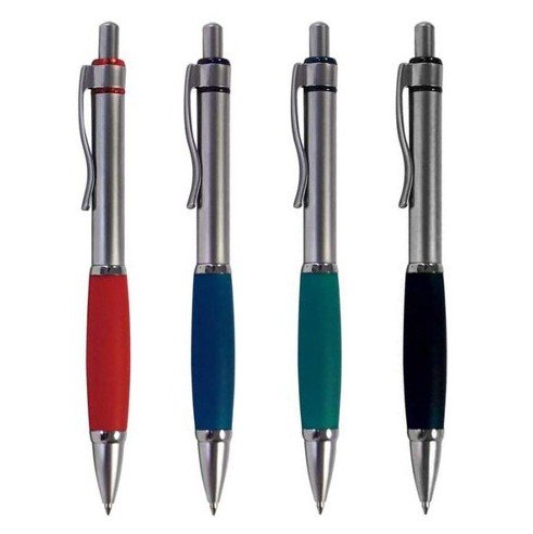 с нажимной механикой. Серебристый корпус с цветной резиновой вставкой в зоне грифа и декоративным элементом под клипом. Пластиковый стержень