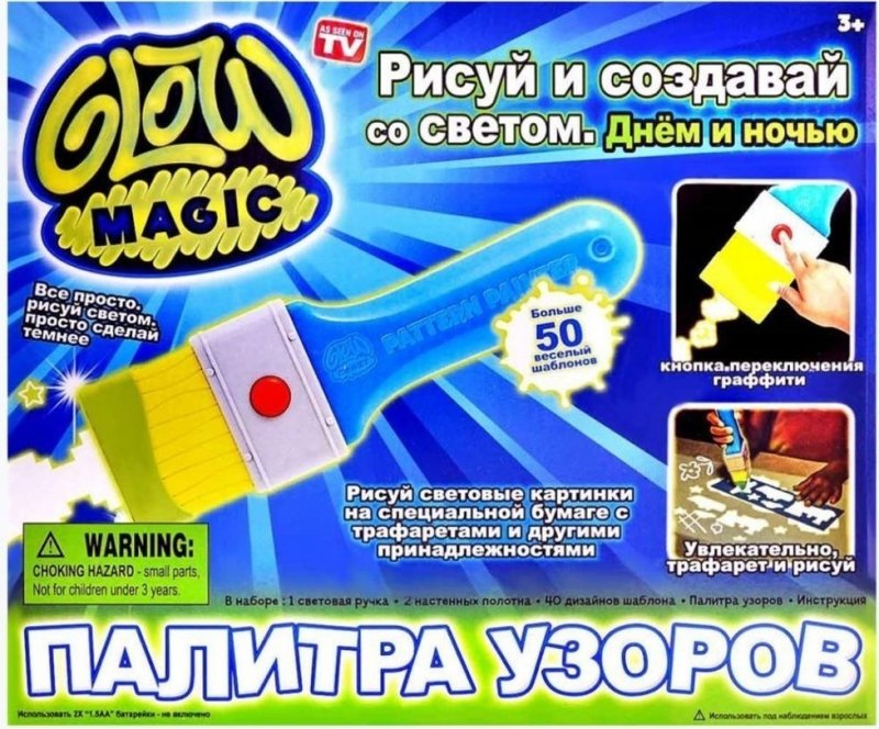 Комплектация: 1 световая кисть, 2 настенных полотна, 40 шаблонов, палитра узоров, инструкция.