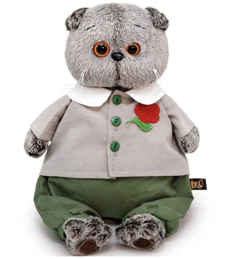 Кот игрушечный мягкий Basik&Сo Басик в комплекте с цветком (Ks19 - 225). Басик в очень милом костюмчике. Рубашка красивого сложного оттенка с отложным белоснежным воротничком, на зеленых пуговках спереди. Украшена вышитым алым цветком. Также на Басике широкие х / б штанишки плотного елового цвета. Вид мягкой игрушки: Кошка; Цвет: разноцветный; Высота игрушки: 19; Минимальный возраст ребенка: От 3 лет; Максимальный возраст ребенка: До 18 лет;