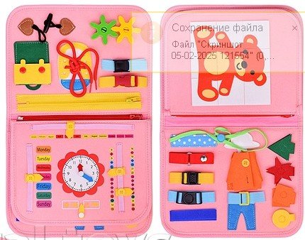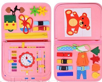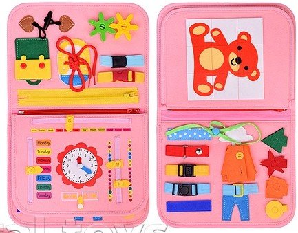 Бизиборд содержит 25 элементов из текстиля фетра пластика (замки, шнуровка, пуговицы, пазл, часы, цифры, цвета, формы).
