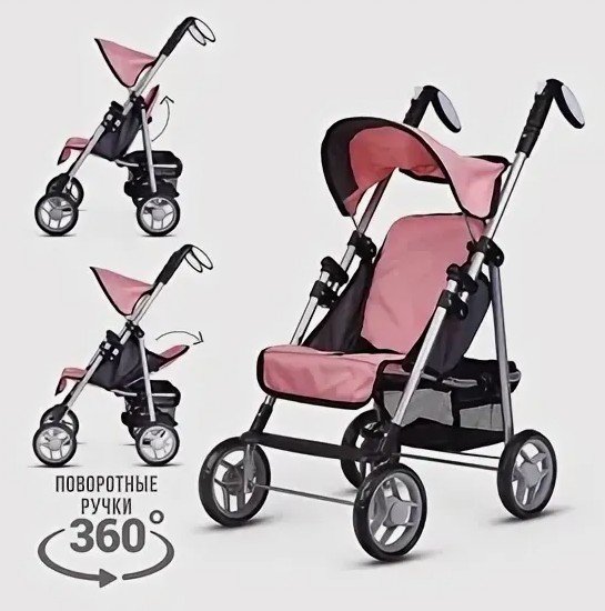 - Коляска для кукол металлическая, складная, прогулочная с козырьком, с корзиной, цвет розовый 9351