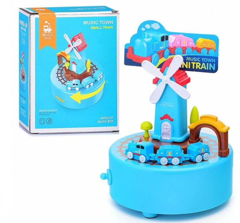 Заводной механизм и магниты позволяют поезду двигаться по кругу под классическую мелодию без батареек.