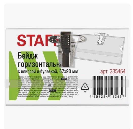 Бейдж горизонтальный (57х90мм), с клипсой и булавкой, мягкий, STAFF Basic