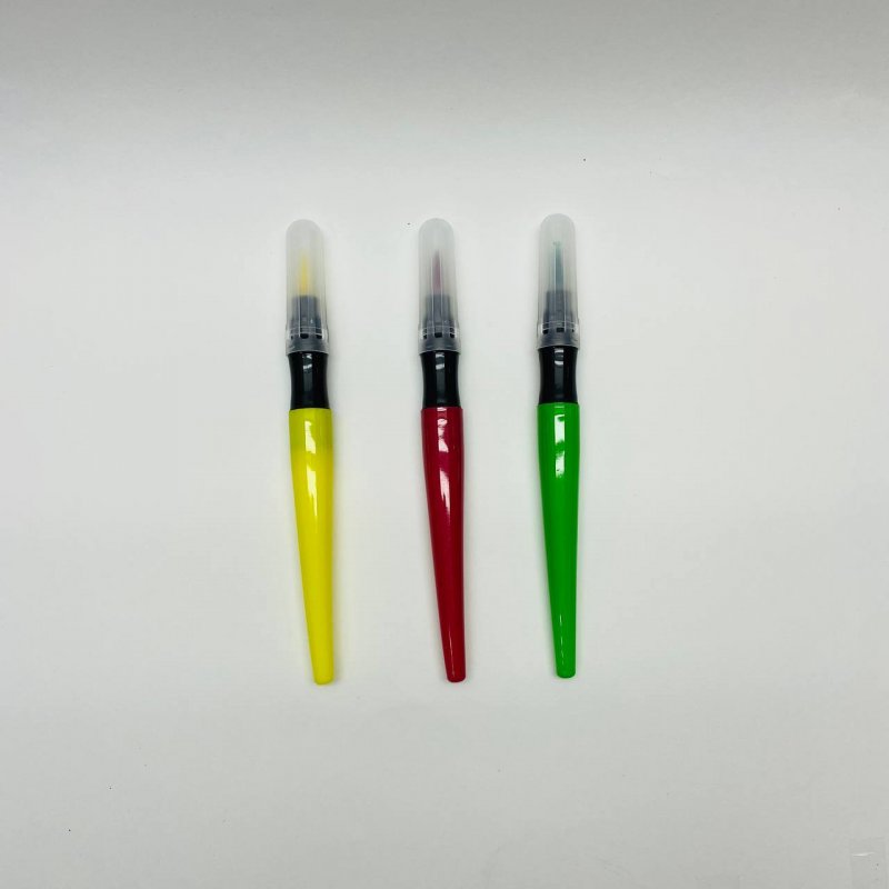 На водной основе. Чтобы подать краску кисть, слегка надавите на мягкие стороны резервуара; рисуйте, как обычной кистью; закончив рисовать, промойте кисть водой, дайте ей высохнуть и наденьте на нее колпачок. Легко смываются. 3 штуки по 2 мл. оранжевый, голубой, коричневый