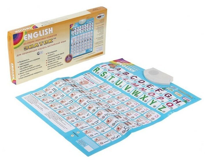 Электронный звуковой плакат English Звуковой плакат "English" рассчитан на детей от 5-ти лет и на взрослых, начинающих изучать английский язык. Это репетитор с настоящим английским произношением, который дает возможность изучить транскрипцию и произношение звуков и букв английского языка, как самостоятельно, так и с преподавателем. С помощью кнопки "Экзамен" плакат поможет проверить умение в узнавании букв и звуков. Регулируемая громкость воспроизведения позволит Вам не мешать соседям, а соседям - не мешать Вам при изучении английского языка. Звуковой плакат "знаток"™ адаптирован под известные курсы изучения английского языка профессора Н.А.Бонк.