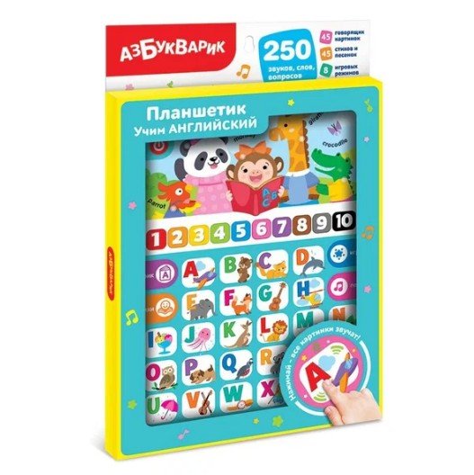 Нажимая на картинки, ребенок выучит английский алфавит и слова на каждую букву, а также названия цифр, форм и цветов на английском языке.