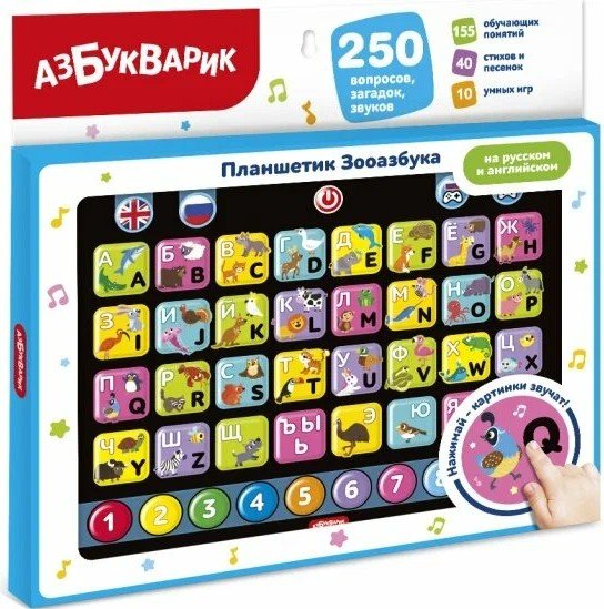 Учить английский язык – невероятно просто и увлекательно со стильным Планшетиком «Зооазбука на русском и английском»! Достаточно просто нажимать на картинки и переключать языковые режимы. Русский и английский алфавиты, цифры, формы, цвета, названия животных на обоих языках – вот такой насыщенный контент у этой замечательной новинки от «Азбукварика»! А ещё вас ждёт 10 умных игр, 40 стихов и песенок, 155 обучающих понятий! Планшетик «Зооазбука на русском и английском» – идеальный подарок для будущих полиглотов!