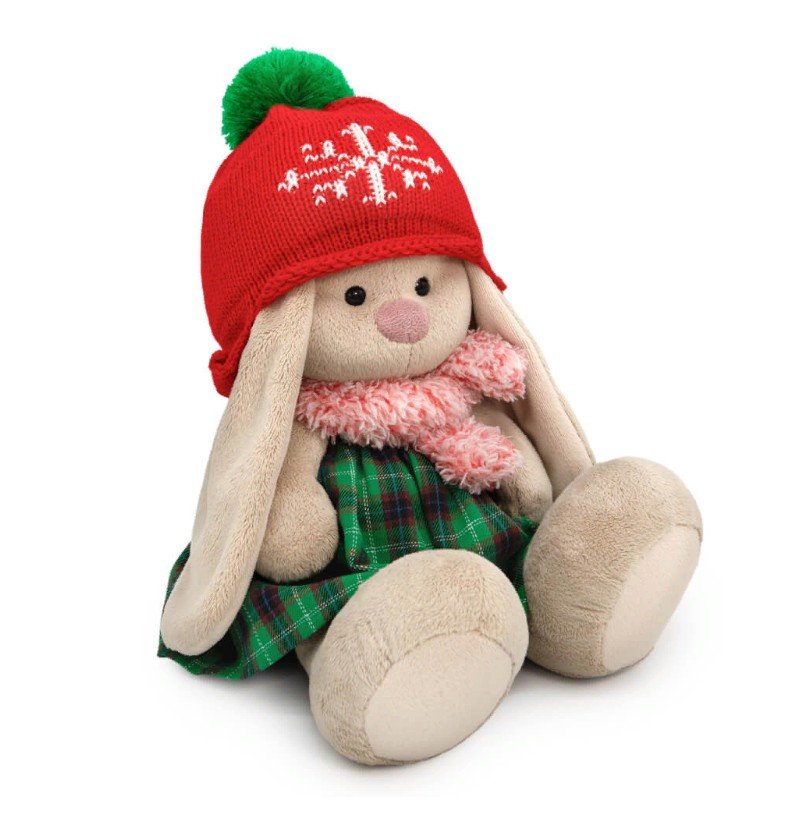 Зайка Ми в красивом комплекте. Вязаная шапочка из алого акрила с вывязанной белой снежинкой спереди и объемным зеленым помпоном. Юбка из плотной костюмной ткани в клетку. Мягкий шарф из двустороннего эко‑меха с кораллово‑белым ворсом.
