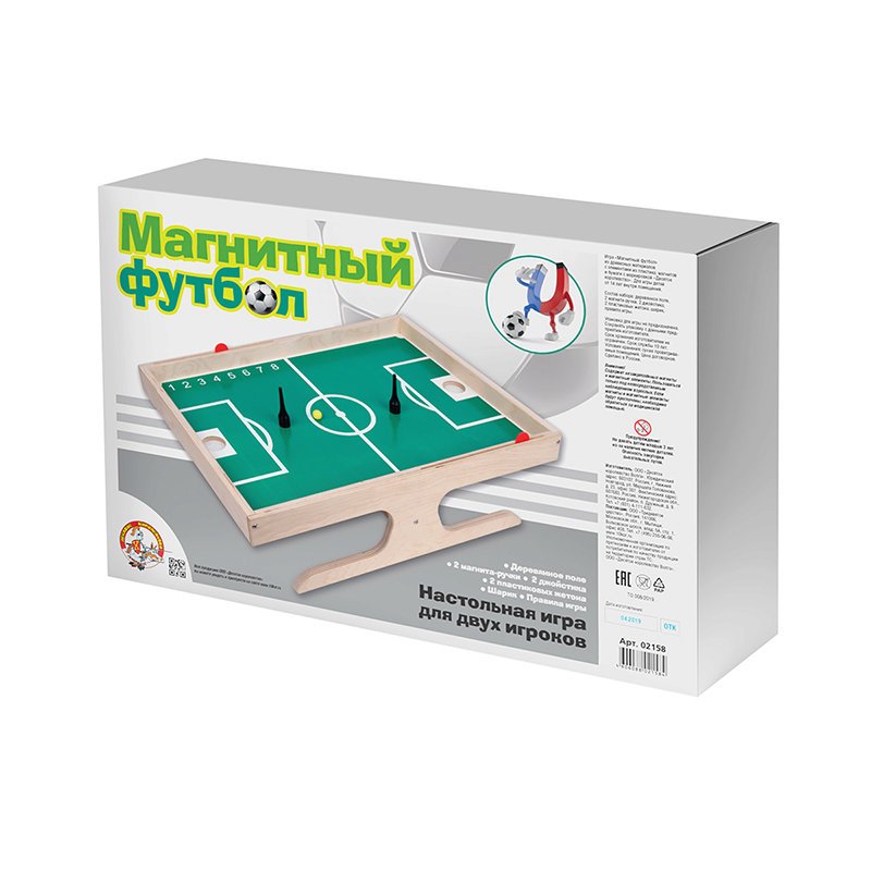 Перед тобой – игра, заражающая энергией и азартом! Знакомься с правилами в разделе «Поддержка» , разминай руки и в бой! Желаем больше побед! Состав: • деревянное поле (47х34,5х14 см) • 2 магнита-ручки • 2 джойстика • 2 пластиковых жетона • шарик Управление 1. Возьми магнит-ручку и прижми его с нижней стороны деревянного поля 2. В том же месте, но сверху, установи джойстик, чтобы они примагнитились друг к другу 3. Двигай магнитом снизу – и твой джойстик оживёт! Теперь дело за малым – забивай голы в ворота соперника и побеждай!
