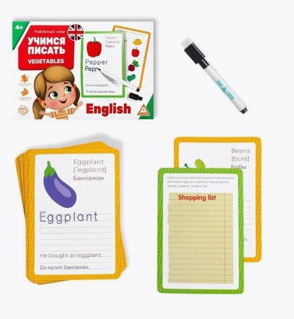 - Развивающий набор пиши-стирай «Учимся писать. Vegetables», 15 карт, 4+ 6914392