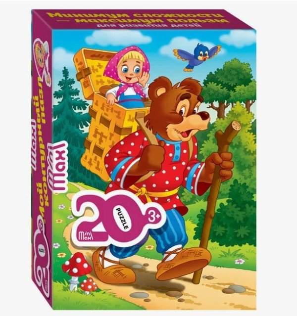 Пазл mini-maxi выполнен из толстого картона и состоит из 20 больших деталей, которые малышу будет удобно держать в руках и складывать из них общую картинку. К слову, о картинке! На ней изображен самый знаменитый эпизод из популярной детской сказки – когда Маша забралась в короб к Мишке, чтобы таким хитрым образом вернуться домой. Размер собранной картинки – 21,5 х 15,5 см. Размер одной детали – 3,2 х 4,3 см. Пазл подойдет для детей от 3 лет.