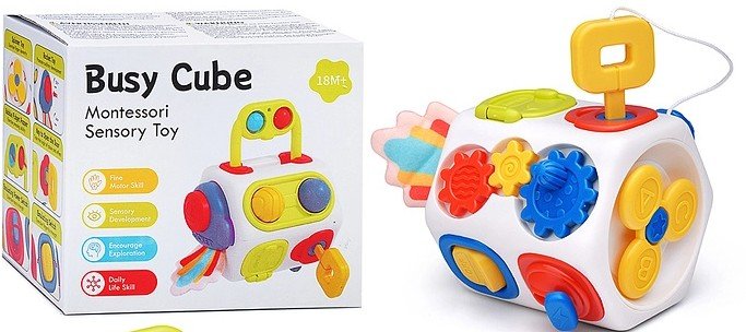 • Игрушка содержит вращающиеся детали, нажимающиеся кнопки, поворачивающиеся рычаги и пищалку.