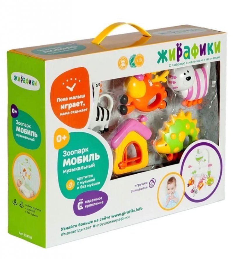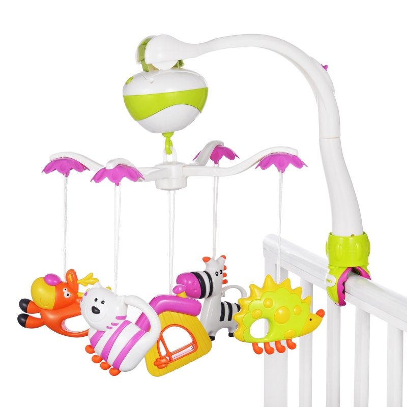 Музыкальная подвеска предназначена для размещения над детской кроваткой. Мобиль — это одна из первых игрушек для новорожденных и уникальный тренажер для развитиявизуального восприятия и слуховых ощущений. Забавные зверюшки, прикрепленные к мобилю, поворачиваются по кругу, как карусели. Пытаясь следить за ними глазами, малыш учится фокусировать взгляд на объекте. Игрушки можно снимать и давать играть с ними ребенку отдельно. Изделие работает в двух режимах:"кручение с музыкой"и"кручение без музыки".Для включения музыки переведите переключатель в положение"ON",для выключения — в положение"OFF".Игрушка работает от 3-х батареек.